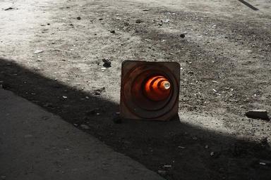 Keywords: cone traffic_cone trafficcone gray orange orange_on_gray orangeongray ground sunlight contrast outdoor