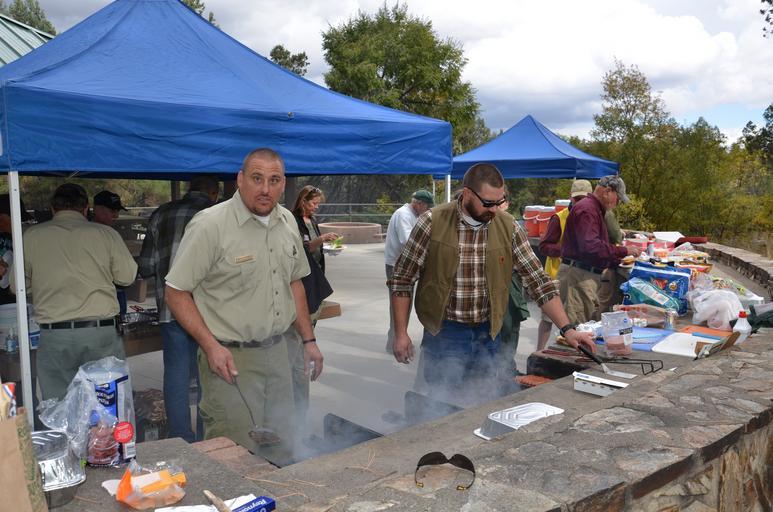 Keywords: Tom Palmer and Justin Ragan cooking burgers and dogs, U.S. Forest Service Photo by Betsy Hilgendorf, Thumb Butte Picnic Area, Prescott National Forest, 10/29/15