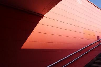 Keywords: underpass orange gradient geometry shadow light contrast rather_minimal ratherminimal railing sky metal