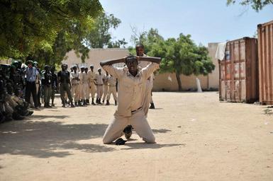 | Keywords: amisom au africa african union africanunion mogadishu police spf search somali police force somalipoliceforce somalia arrest capacity building capacitybuilding policing security training outdoor A Somali police officer is handcuffed in a training demonstration at General Kahiye Police Academy in Mogadishu, Somalia, on June 16. The African Union is currently training one hundred Somali Police officers in a program aimed at equipping the Somali Police Force with the necessary skills to effectively arrest suspects, stop vehicles at checkpoints, and cordon off areas. AMISOM Photo / Tobin Jones A Somali police officer is handcuffed in a training demonstration at General Kahiye Police Academy in Mogadishu, Somalia, on June 16. The African Union is currently training one hundred Somali Police officers in a program aimed at equipping the Somali Police Force with the necessary skills to effectively arrest suspects, stop vehicles at checkpoints, and cordon off areas. AMISOM Photo / Tobin Jones |