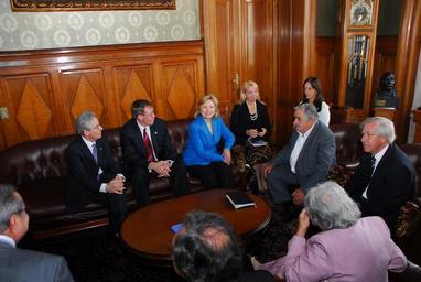 | Keywords: visdip clinton mujica uruguay indoor Secretary of State Hillary Clinton meets with Uruguayan President-elect José Mujica and Vice President-elect Danilo Astori, a few hours before the Inauguration Ceremony. Also in the meeting are: U.S. Ambassador to Uruguay David Nelson, Assistant Secretary Arturo Valenzuela, Uruguayan Ambassador to the U.S. Carlos Gianelli, and future First Lady, Senator Lucía Topolansky. [State Department photo by Vince Alongi / Public Domain] Secretary of State Hillary Clinton meets with Uruguayan President-elect José Mujica and Vice President-elect Danilo Astori, a few hours before the Inauguration Ceremony. Also in the meeting are: U.S. Ambassador to Uruguay David Nelson, Assistant Secretary Arturo Valenzuela, Uruguayan Ambassador to the U.S. Carlos Gianelli, and future First Lady, Senator Lucía Topolansky. [State Department photo by Vince Alongi / Public Domain] |
