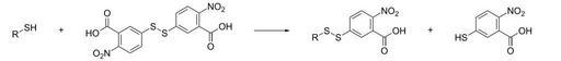 Keywords: DTNB reaction with thiol.svg Chemical reaction of Ellman's reagent 5 5'-dithiobis- 2-nitrobenzoic acid or DTNB with a thiol Own 13 01 9 December 2010 UTC Edgar181 <span class signature-talk >talk</span> Chemical reactions