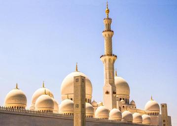 Keywords: dubai mosque blue gold blue sky day architecture sun summer doha monument
