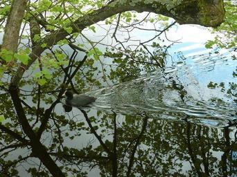 Keywords: duck foliage water heaven reflection green trees shine water surface backlight nature wave wavy clouds love search blue light