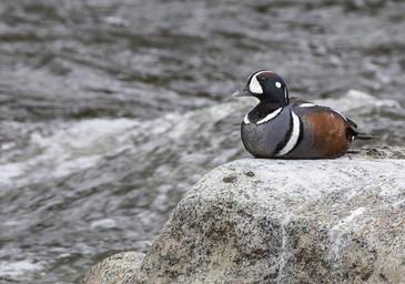 Keywords: duck harlequin bird waterfowl resting rock river shore bank landscape nature colorful wildlife wild