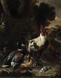 | Keywords: Ducks, hens and other fowl in a yard.jpg Artwork en Ducks hens and other fowl in a yard oil on canvas Size cm 100 3 78 2 object history Charles Scarisbrick Esq Scarisbrick Hall and Weightington Hall Lancashire; + Christie's London 11 May 1861 lot 42 101 gns to Bale Colonel C E Coghill Fern Hill Market Dratyon; Christie's London 13 April 1923 lot 45 410 gns Colonel M A W Swinfen Broun Swinfen Hall Lichfield; + Christie's London 10 December 1948 lot 98 75 gns to Wengraf exhibition history credit line signed 'M D Hondecoeter' center left on the fence accession number place of creation http //www christies com/lotfinder/paintings/melchior-dhondecoeter-ducks-hens-and-other-fowl-5403362-details aspx PD-old-100 Uploaded with UploadWizard Paintings by Melchior d'Hondecoeter |