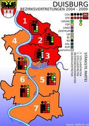 | Keywords: Duisburg-bez2004-2009.svg Bezirksvertretungen und Bezirksbürgermeister von Duisburg 2004 - 2009 Stand 2009-01-10 <br> Parteien und Wählergemeinschaften<br> UB Unabhängiges Bündnis<br> BL Bürgerlich-Liberale<br> BU Bürger Union Duisburg<br> DAL Duisburger Alternative Liste<br> KUR Kur Partei <br>Bezirke<br> 1 Walsum<br> 2 Hamborn<br> 3 Meiderich / Beeck<br> 4 Homburg / Ruhrort / Baerl<br> 5 Mitte<br> 6 Rheinhausen<br> 7 Süd own Vinom 2009-01-10 Maps of Duisburg | ||||