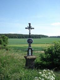 | Keywords: Dukovany Kříž04 Čurdův.jpg cs 4 kříž na cestě do Jamolic- Čurdův Nachází se na odbočce z hlavní cesty směrem k elektrárně Havránek Je umístěn na poli zvaném Vinohrádky Spodní část kříže je kamenná korpus je litinový Pod Kristem je oválná litinová tabulka na které je nápis Já jsem cesta pravda a život Kříž nechali postavit manželé Čurdovi Bylo to v roce 1869 když se manželům Čurdovým Martinu a jeho ženě roz Hudečkové M z Lukova narodil syn Václav Kříž byl několikrát shozen ale vždy opraven vlastní author 1869 Crosses in Vysočina Region Dukovany |