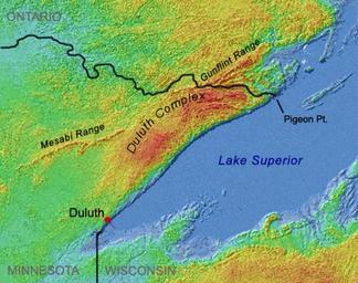 | Keywords: Duluthcomplexmap.png http //www geo umn edu/mgs/srtm_15in jpg Shaded-relief image of northeast Minnesota and adjoining areas in central North America 90 meter grid Shuttle Radar Topography Mission SRTM of http //www2 jpl nasa gov/srtm/ NASA Jet Propulsion Laboratory republished by University of Minnesota Department of Geology and Geophysics The crescent-shaped region north of Lake Superior between Duluth and Pigeon Point is the Duluth Complex Original image has been cropped labels were added and state borders have been emphasized PD-USGov Geology of Minnesota Maps of Lake Superior Geological maps of North America |