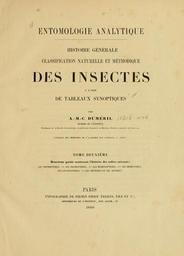 | Keywords: DumérilEntomologieAnalytique.jpg en Dumeril C A -M 1806 Zoologie analitique ou methode naturelle de classification des animaux rendue plus facile a l'aide de tableaux synoptiques Paris Allais Libraire Quaides Augustins No 39 344 pp Dumeril C A -M 1806 Analitische Zoologie Aus dem Franz mit Zusatzen von L F Froriep Weimar Verl des Lendes-Industrie-Comptoirs 1-343 AHH Ms Abstract Animaux 1 classis Mammalia 2 classis Aves - Oiseaux 3 classis Reptilia - Reptiles 4 classis Pisces - Poissons 5 classis Mollusca - Mollusques 6 classis Crustacea - Crustaces 7 classis Insecta - Insectes 1 ordo Coleopteres Eleuterata Fab 1 subordo Pentamérés/Pentameriden 1 fam Carnassiers Creophages/Creophagen gen anthia Weber gen cychrus Fab gen tachypus Weber gen carabus Linn gen calosoma Weber gen brachinus Weber gen cicindela gen colliurus de Geer gen manticora Fab gen drypta Fab gen elaphes Elaphrus gen bembidions Bembidion Latreille gen clivina Latr gen scarites Fab gen nothiophilus gen Omophron 2 fam Remipedes Nectopodes/Nectopoden gen dytiscus Lin gen hyphydrus gen haliplus gen gyrinus 3 fam Brevipennes Brachélytres/Brachelytren gen staphylinus Linn gen oxyporus Fabricius gen paederus Fab gen stenus Latreille gen lesteva Latr 4 fam Lamellicornes Petaloceres/Petaloceren gen geotrupes Latreille gen copris Geoff gen aphodius Illiger gen scarabaeus Linn gen melolontha Linn gen cetonia gen trichius Fab gen trox Fabricius 5 fam Serricornes Proiceres/Prioceren gen lucanus Linn gen platycerus Geoffroy gen passalus Fab gen synodendron Fab 6 fam Clavicornes Héloceres/Heloceren gen sphaeridium Fab gen scaphidium Olivier gen nitidula Fab gen silpha Fab gen peltis Geoff gen necrophorus Fab gen elophorus gen parnus Fab gen hydrophilus Geoff gen dermestes Linne gen byrrhus Fab 7 fam Solidicornes Steréocères/Stetreoceren gen lethrus Fab bulbocerus Thunberg gen hister Linne gen anthrenus Fab 8 fam Thoraciques Sternoxes/Sternoxyten gen atopa Paykull gen cebrio Olivier gen elater Linn gen throscus Lat gen buprestis Linne gen trachys Fab 9 fam Percebois Térédiles/Teredylen gen anobium Fab gen ptilinus Geoff Fab gen ptinus Linn gen melasis gen tillus Oliv gen lymexylon 10 fam Mollipennes Apalytres/Apalytern gen drilus Oliv gen lycus Fab gen omalysus Geoffroy gen melyris Olivier gen lampyrus Linn gen malachius Fab gen telephorus de Geer gen cyphon Paykull 2 subordo Hétéromérés/Heteromeriden 11 fam Vésicans Épispastiques/Epispasten gen dasytes Paykull gen lagria Fab gen anthicus Paykull gen notoxus Schaeff gen meloe gen cantharis Geoffroy litta Fabricius gen cerocoma Geoff gen mylabris Fab gen apalus Fab gen zonitis Fab 12 fam Angustipennes Sténoptères/Stenopteren gen sitaris gen oedemera Oliv gen necydalis Fab gen ripiphorus Fab gen mordella Linne gen anaspis 13 fam Sylvicoles Orneophiles/Orneophilen gen helops Fabricius gen serropalpus Olivier gen cistela Fab gen calopus Fab gen pyrochroa Geoff gen horia Fab 14 fam Tenebricoles Lygophiles/Lygophilen gen upis Fab gen tenebrio Linn gen opatrum Fab gen pedinus Latreille gen sarrotrium Illiger 15 fam Lucifuges Photophyges/Phytophygen gen blaps gen pimelia Fab gen eurychora Thunberg gen akis Fab gen scaurus Fab gen sepidium Fab gen erodius Fab gen zophosis Latreille gen tagenia Lat 16 fam Fungivores Mycetobies/Mycetobien gen boletophagus Illiger gen hypophloeus Paukull gen anisotoma Knoch gen agathidium Illiger gen diaperis Geoffroy gen cnodulon Fabr gen tetratoma gen Cossiphe Cossyphus 3 subordo Tetrameres/Tetrameriden 17 fam Rosticornes Rhinoceres/Rhinoceriden gen bruchus Linn mylabris Geoff gen rhinomacer Fab gen anthribus Geoff gen brachycerus Oliv gen attelabus Linne gen oxystoma gen curculio Linne gen ramphus gen rynchaenus Clairville gen brenthus Fab 18 fam Cylindriformes Cylindroides/Cylindroiden gen apate Fab gen bostrichus gen scolitus Geoff gen clerus Linn trichodes Herbst Fab gen corynetes Fab necrobia Lat 19 fam Planiformes Omaloides/Omaloiden gen lyctus gen colydium Paykull gen trogosita Oliv gen cucujes Cucuje Cucujus gen Ips gen mycetophages Mycetophage Mycetophagus gen heterocères Heterocere Heterocerus 20 fam Lignivores Xylophages/Xylophagen gen rhagium Fab gen leptura Linn gen molorchus Fab Necydalis Geoff gen callidium Fab gen saperda Fab gen cerambyx Linn gen lamia Fab gen prionus Fab 21 fam Herbivores Phytophages/Phytophagen gen donacia Fab gen crioceris Geoff Lema Fab gen hispa Fab gen helodes Paukull gen lupeus Geoff gen galeruca Geoff gen altica Geoff gen cryptocephalus Fab gen clythra Laichart gen chrysomela Linn gen alurnus Fab gen erotylus Oliv gen cassida Linn gen spondylis Fab gen cucujus Fab 4 subordo et 22 fam Tridactyles Trimeres/Trimeriden gen dasycerus Brongniart gen eumorphus Weber gen endomychus Paukull gen coccinella Linn gen scymnus Herbst 2 ordo Orthopteres / Orthopteren Olivier fam Forficules Forficula Labidoures/Labidouren gen forficula Linn fam Blattes/Blatten gen blatta Linne fam Difformes Anomides/Anomiden gen mantis Linn gen phyllium Illiger gen phasma Fab fam Grylliformes Gryllus Grylloides/Grylloiden Gryllus gen locusta Fab gen truxalis Fab gen gryllus Linne gen acrydium Geoffr gen acheta Linne Fab gen tridactylus Oliv gen gryllotalpa Linne 3 ordo Nevropteres / Neuropteren 1 fam Tectipennes Stegopteres/Stegopteren gen myrmeleon Linn gen ascalaphus Linn gen termes gen psocus Linn gen hemerobius Linn gen panorpa Linn gen raphidia Linn gen semblis Linn gen perla Linn 2 fam Bucceles Agnathes/Agnathen gen ephemera Linn gen phryganea Linn 3 fam Libelles/Libellen Libellula Odonates/Odonaten gen libellula Linn gen agrion Fab 4 ordo Hyménoptères / Hymenopteren fam Apiaires Apis Mellites/Melliten gen apis Linn gen eucera Fab gen nomada Fab gen andraena Fab gen hylaeus Fab gen bembex Fab fam Duplicipennes Pterodiples / Pterodiplen gen vespa Linn gen masaris Fab fam Chrysides/Chrysiden Chrysis gen parnopes Lat gen chrysis fam Florileges Anthophiles/Anthophilen gen philanthus Fab gen scolia Fab gen crabro Linn gen me