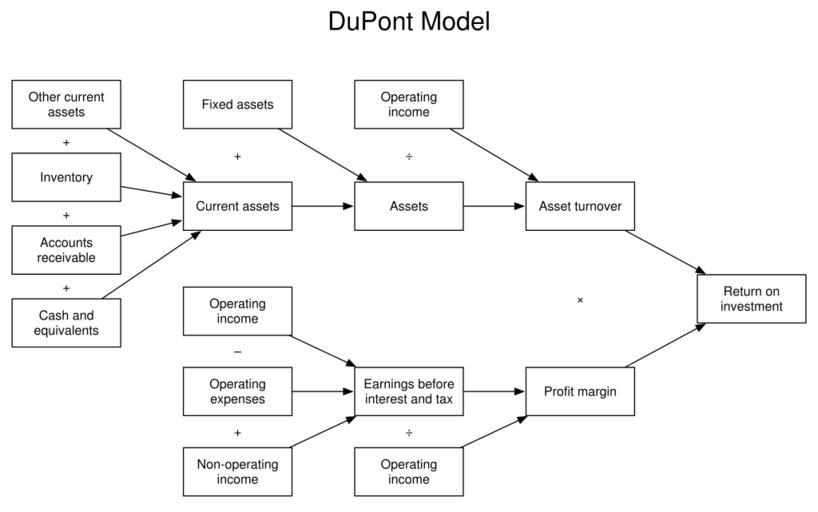 Keywords: DuPontModelEng.svg en Diagram of DuPont analysis of return on equity no Diagram over DuPont-analyse av kapitalrentabilitet own Tapir666 2010-11-18 Cc-zero Business Finance diagrams Finance