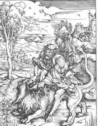 | Keywords: Dürer - Samsoms Kampf mit dem Löwen.jpg en Samsoms fight against the lion de Samsoms Kampf mit dem Löwen repro from art book Creator Albrecht Dürer 1471-05-21; 1528-04-06 Author died more than 70 years ago - public domain PD-old-100 Woodcuts by Albrecht Dürer 1489-1500 |