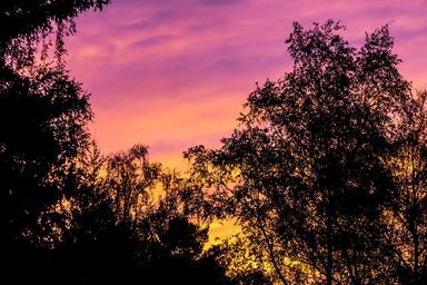 Keywords: dusk sky glow yellow orange purple red back light autumn trees tree plant evening abendstimmung mood twilight evening sky sunset clouds dark