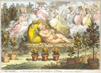 | Keywords: Dutch-Cupid-Gillray.jpeg The Orangerie; ”or ”the Dutch Cupid reposing after the fatigues of Planting / Js Gy inv et fect CALL NUMBER PC 1 - 8822 B size P P REPRODUCTION NUMBER LC-USZC4-8765 color film copy transparency SUMMARY William V Prince of Orange as a fat naked Cupid reclining on a platform of grass and flowers and leaning on a bag of money marked 24 000 000 ducats In the foreground are a number of orange plants with each orange bearing the likeness of the prince In the background as if in a dream are many heavily pregnant women a milkmaid a fishmonger a house maid and many farm women MEDIUM 1 print etching hand-colored CREATED/PUBLISHED London H Humphrey 1796 Septr 16th Library of Congress Prints Photographs Division LC-USZC4-8765 color film copy transparency http //memory loc gov/master/pnp/cph/3g00000/3g08000/3g08700/3g08765u tif uncompressed archival TIFF version 50 MB rotated cropped and converted to JPEG quality level 88 with the GIMP 2 4 5 1796-09-16 creator James Gillray No known restriction on publication LOC-image cph 3g08765 PD-old-100 James Gillray 1796 cartoons Caricatures of the United Kingdom Cupido Oranges in art Pregnant women in art William V Prince of Orange Dreaming in art Sitting people in art Leaning people in art Sleeping people in art Engravings of nude males Nude recumbent men Milkmaids in art Moneybags Batavian Republic |
