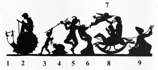 | Keywords: Duttenhofer, Luise, Familie Duttenhofer mit Christian Duttenhofer auf der Schnecke, mit Nummerierung.jpg Luise Duttenhofer Humoristisches Idyll der Familie Duttenhofer mit dem Familienoberhaupt als Schneckenritter Nummerierung hinzugefügt schwarzer Scherenschnitt Abmessungen unbekannt um 1820 Bedeutung der Figuren nach ihrer Nummer Eine stachlige Riesenschnecke auf deren Hörnern ein bocksfüßiger Faun mit einer geflügelten Psyche tanzt eine Figur die die Duttenhofer gerne als Emblem für ihre eigene Person verwendete Luises Mann Christian Duttenhofer reitet auf der Schnecke und skizziert Faun und Psyche Ein geflügelter nackter Amor schwingt seinen riesigen Pfeil hinter sich in die Lüfte als wolle zu einem heftigen Schlag ausholen auf den Schneckenritter Eine Katze kauert in Lauerstellung und mit gesträubten Rückenhaaren auf einem niedrigen Sitz der mit einem bequemen Quastenkissen belegt ist Ein lustiger Harlekin mit einer zweizipfeligen Schellenkappe tänzelt auf einem Bein Er hält er eine Handpuppe in den Händen der ein beblätterter Zweig aus dem Hinterkopf herauswächst Die Spitze des Amorpfeils weist unmittelbar in die Augen des Puppenkopfs Die Tochter Marie sitzt in der Hocke auf dem Boden einen überbordenden Blumenkorb auf dem Kopf den sie dem Harlekin mit emporgestreckten Armen darreicht Eine Amorette fliegt herbei und lässt den Sohn Fritz rechts auf dem Schaukelpferd an einer Blume riechen Auf einem Schaukelpferd sitzen die beiden Söhne Anton und Fritz Anton der kleinere von beiden liest in einem Buch; Fritz riecht an der Blume die ihm die fliegende Amorette darbietet Luise Duttenhofer kauert am Boden in der linken Hand hält sie die Schere das Attribut ihrer Kunst und mit der rechten führt sie das Schaukelpferd am Zügel Pazaurek Gustav Edmund Die Scherenkünstlerin Luise Duttenhofer 1776-1829 Stuttgart 1924 Tafel 2 Luise Duttenhofer 1776-1829 um 1820 PD-old Paper cuts by Luise Duttenhofer Christian Friedrich Traugott Duttenhofer |
