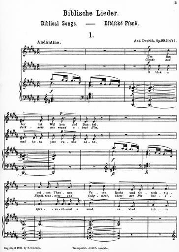 | Keywords: Dvorak's Biblicke Pisne i-3.jpg Dvorak's_Biblicke_Pisne_i- jpg 2 4 Antonín Dvořák's Biblícké Písně Biblical Songs Op 99 1884 Book 1 containing Songs 1-5 While Dvorak later orchestrated the work this the complete original piano-and-voice version While the massacre of the original music to fit the German and English is appalling it does contain the original Czech and the original music for the Czech The German and English should probably be considered only as a translation This is the first five songs out of ten the other five are printed in a second volume I have not yet tracked down I haven't been able to find Book 2 unfortunately 1895 copy in my own possession The only copyright claimed on the sheet music itself is to N Simrock which is a publishing house Antonin Dvorak PD-Old Original Czech From http //music ibiblio org/pub/multimedia/pandora/vorbis/contrib/Marta_Chaloupka_Live/Czech notes accompanying the Pandora Music recording 1 Psalm 97 2-6 Oblak a mrákota jest vůkol Něho spravedlnost a soud základ trůnu Jeho Oheň předchází jej a zapaluje vůkol nepřátele Jeho Zasvěcujíť se po okršlku světa blýskání Jeho; to vidouc země děsí se Hory jako vosk rozplývají se před obličejem Hospodina panovníka vší země a slávu jeho spatřují všichni národové 2 Psalms 119 114-117 119 120 Skrýše má a pavéza má Ty jsi na slovo Tvé očekávám Odstuptež ode mne nešlechetníci abych ostříhal přikázaní Boha svého Posiluj mne bych zachován byl a patřil k ustanovením Tvým ustavičně Děsí se strachem před Tebou tělo mé; nebo soudů Tvých bojím se náramně 3 Psams 55 1 2 4/5 6 7 8 Slyš ó Bože Slyš modlitbu mou a neskrývej se před prosbou mou Pozoruj a vyslyš mne neboť naříkám v úpění svém a kormoutím se Srdce mé tesklí ve mně a strachové smrti přišli na mne a hrůza přikvačila mne I řekl jsem Ó bych měl křídla jako holubice zaletěl bych a poodpočinul Aj daleko bych se vzdálil a přebýval bych na poušti Pospíšil bych ujíti větru prudkému a vichřici 4 Psalms 23 1-4 Hospodin jest můj pastýř nebudu míti nedostatku Na pastvách zelených pase mne k vodám tichým mne přivodí Duši mou občerstvuje vodí mne po stezkách spravedlnosti pro jméno své Byť mi se dostalo jíti přes údolí stínu smrti nebuduť se báti zlého nebo Ty se mnou jsi; a prut Tvůj a hůl Tvá toť mne potěšuje 5 Psalms 144 9 145 1-3 5 6 Bože Bože píseň novou zpívati budu Tobě na loutně a žalmy tobě prozpěvovati Na každý den dobrořečiti budu Tobě a chváliti jméno Tvé na věky věků Hospodin jistě veliký jest a vší chvály hodný a velikost jeho nemůž vystižena býti O slávě a kráse a velebnosti Tvé i o věcech Tvých předivných mluviti budu A moc přehrozných skutků Tvých vsichni rozhlašovati budou; i já důstojnost Tvou budu vypravovati 6 Psalms 61 1 3 4 63 1 4/5 Slyš ó Bože volání mé pozoruj modlitby mé Nebo jsi býval útočiště mé a pevná věže před tváří nepřítele Buduť bydliti v stánku tvém na věky schráním se v skrýši křídel tvých Bože Bůh silný můj ty jsi tebeť hned v jitře hledám Tebe žízní duše má po tobě touží tělo mé v zemi žíznivé a vyprahlé v níž není vody A tak abych tobě dobrořečil a s radostným rtů prozpěvováním chválila by tě ústa má 7 Psalms 137 1-5 Při řekách Babylonských tam jsme sedávali a plakávali rozpomínajíce se na Sion Na vrbí v té zemi zavěšovali jsme citary své když se tam dotazovali nás ti kteříž nás zajali na slova písničky říkajíce Zpívejte nám některou píseň Sionskou Odpovídali jsme Kterakž bychom mohli zpívati píseň Hospodinovu v zemi cizozemců Jestliže se zapomenu na tebe ó Jeruzaléme ó zapomeniž i pravice má umění svého 8 Psalms 25 16-18 20 Popatřiž na mne a smiluj se nade mnou neboť jsem opuštěný a strápený Soužení srdce mého rozmnožují se z úzkostí mých vyveď mne z úzkostí mých vyveď mne Smiluj se nade mnou Viz trápení mé a bídu mou a odpusť všecky hříchy mé Ostříhej duše mé a vytrhni mne ať nejsem zahanben neboť v tebe doufám neboť v tebe doufám 9 Psalms 121 1-4 Pozdvihuji očí svých k horám odkud by mi přišla pomoc Pomoc má jest od Hospodina kterýž učinil nebe i zemi Nedopustíť aby se pohnouti měla noha tvá nebo nedřímeť strážný tvůj Aj nedřímeť ovšem nespí ten kterýž ostříhá Izraele 10 Psalms 98 1 4/5 7 8 96 12/11 Zpívejte Hospodinu píseň novou neboť jest divné věci učinil Zvuk vydejte prozpěvujte a žalmy zpívejte Zvuč moře i to což v něm jest okršlek světa i ti což na něm bydlí Řeky rukama plésejte spolu s nimi i hory prozpěvujte Plésej pole a vše což na něm plésej země zvuč i moře i což v něm jest Biblické písně Psalm 97 Biblické písně Music in 1894 Christianity in the Czech Republic Czech language |