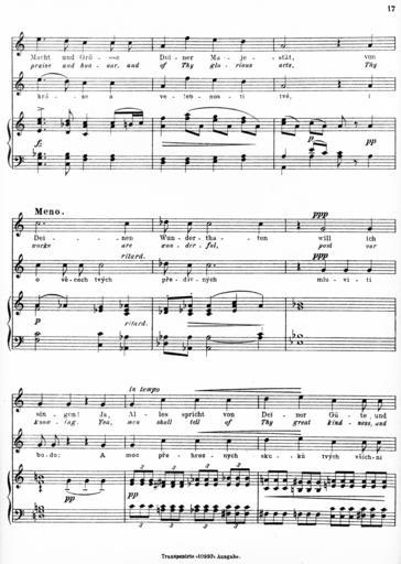 | Keywords: Dvorak's Biblicke Pisne i-17.jpg Dvorak's_Biblicke_Pisne_i- jpg 16 18 Antonín Dvořák's Biblícké Písně Biblical Songs Op 99 1884 Book 1 containing Songs 1-5 While Dvorak later orchestrated the work this the complete original piano-and-voice version While the massacre of the original music to fit the German and English is appalling it does contain the original Czech and the original music for the Czech The German and English should probably be considered only as a translation This is the first five songs out of ten the other five are printed in a second volume I have not yet tracked down I haven't been able to find Book 2 unfortunately 1895 copy in my own possession The only copyright claimed on the sheet music itself is to N Simrock which is a publishing house Antonín Dvořák 1841 1904 PD-Old Original Czech From http //music ibiblio org/pub/multimedia/pandora/vorbis/contrib/Marta_Chaloupka_Live/Czech notes accompanying the Pandora Music recording 1 Psalm 97 2-6 Oblak a mrákota jest vůkol Něho spravedlnost a soud základ trůnu Jeho Oheň předchází jej a zapaluje vůkol nepřátele Jeho Zasvěcujíť se po okršlku světa blýskání Jeho; to vidouc země děsí se Hory jako vosk rozplývají se před obličejem Hospodina panovníka vší země a slávu jeho spatřují všichni národové 2 Psalms 119 114-117 119 120 Skrýše má a pavéza má Ty jsi na slovo Tvé očekávám Odstuptež ode mne nešlechetníci abych ostříhal přikázaní Boha svého Posiluj mne bych zachován byl a patřil k ustanovením Tvým ustavičně Děsí se strachem před Tebou tělo mé; nebo soudů Tvých bojím se náramně 3 Psams 55 1 2 4/5 6 7 8 Slyš ó Bože Slyš modlitbu mou a neskrývej se před prosbou mou Pozoruj a vyslyš mne neboť naříkám v úpění svém a kormoutím se Srdce mé tesklí ve mně a strachové smrti přišli na mne a hrůza přikvačila mne I řekl jsem Ó bych měl křídla jako holubice zaletěl bych a poodpočinul Aj daleko bych se vzdálil a přebýval bych na poušti Pospíšil bych ujíti větru prudkému a vichřici 4 Psalms 23 1-4 Hospodin jest můj pastýř nebudu míti nedostatku Na pastvách zelených pase mne k vodám tichým mne přivodí Duši mou občerstvuje vodí mne po stezkách spravedlnosti pro jméno své Byť mi se dostalo jíti přes údolí stínu smrti nebuduť se báti zlého nebo Ty se mnou jsi; a prut Tvůj a hůl Tvá toť mne potěšuje 5 Psalms 144 9 145 1-3 5 6 Bože Bože píseň novou zpívati budu Tobě na loutně a žalmy tobě prozpěvovati Na každý den dobrořečiti budu Tobě a chváliti jméno Tvé na věky věků Hospodin jistě veliký jest a vší chvály hodný a velikost jeho nemůž vystižena býti O slávě a kráse a velebnosti Tvé i o věcech Tvých předivných mluviti budu A moc přehrozných skutků Tvých vsichni rozhlašovati budou; i já důstojnost Tvou budu vypravovati 6 Psalms 61 1 3 4 63 1 4/5 Slyš ó Bože volání mé pozoruj modlitby mé Nebo jsi býval útočiště mé a pevná věže před tváří nepřítele Buduť bydliti v stánku tvém na věky schráním se v skrýši křídel tvých Bože Bůh silný můj ty jsi tebeť hned v jitře hledám Tebe žízní duše má po tobě touží tělo mé v zemi žíznivé a vyprahlé v níž není vody A tak abych tobě dobrořečil a s radostným rtů prozpěvováním chválila by tě ústa má 7 Psalms 137 1-5 Při řekách Babylonských tam jsme sedávali a plakávali rozpomínajíce se na Sion Na vrbí v té zemi zavěšovali jsme citary své když se tam dotazovali nás ti kteříž nás zajali na slova písničky říkajíce Zpívejte nám některou píseň Sionskou Odpovídali jsme Kterakž bychom mohli zpívati píseň Hospodinovu v zemi cizozemců Jestliže se zapomenu na tebe ó Jeruzaléme ó zapomeniž i pravice má umění svého 8 Psalms 25 16-18 20 Popatřiž na mne a smiluj se nade mnou neboť jsem opuštěný a strápený Soužení srdce mého rozmnožují se z úzkostí mých vyveď mne z úzkostí mých vyveď mne Smiluj se nade mnou Viz trápení mé a bídu mou a odpusť všecky hříchy mé Ostříhej duše mé a vytrhni mne ať nejsem zahanben neboť v tebe doufám neboť v tebe doufám 9 Psalms 121 1-4 Pozdvihuji očí svých k horám odkud by mi přišla pomoc Pomoc má jest od Hospodina kterýž učinil nebe i zemi Nedopustíť aby se pohnouti měla noha tvá nebo nedřímeť strážný tvůj Aj nedřímeť ovšem nespí ten kterýž ostříhá Izraele 10 Psalms 98 1 4/5 7 8 96 12/11 Zpívejte Hospodinu píseň novou neboť jest divné věci učinil Zvuk vydejte prozpěvujte a žalmy zpívejte Zvuč moře i to což v něm jest okršlek světa i ti což na něm bydlí Řeky rukama plésejte spolu s nimi i hory prozpěvujte Plésej pole a vše což na něm plésej země zvuč i moře i což v něm jest Biblické písně Psalm 144 |