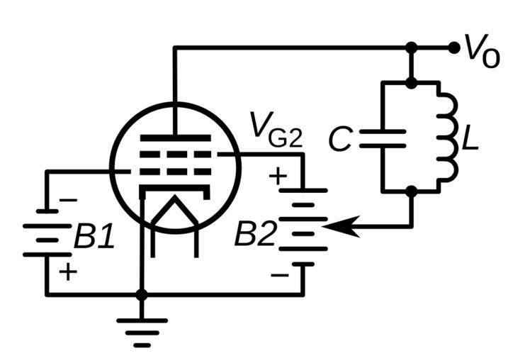 | Keywords: Dynatron oscillator circuit.svg dynatron oscillator a type of vacuum tube electronic oscillator which uses negative resistance caused by secondary emission of electrons from the anode of a tetrode tube The screen grid is biased at a higher voltage than the anode causing secondary electrons knocked out of the plate by electrons from the cathode to flow to the screen Therefore the anode current decreases with an increase in cathode-to-anode voltage The negative differential resistance of the tube cancels the inherent positive resistance of the tuned circuit LC connected across the anode creating in effect a tuned circuit with zero AC resistance Spontaneous oscillations arise at the tuned circuit's resonant frequency <math>\scriptstyle f\; \; 2\pi/\sqrt LC </math> started by noise in the circuit when it is turned on Invented in 1918 by Albert Hull and used from the 1920s to the 1940s the dynatron oscillator is now obsolete 2015-03-19 own Chetvorno other versions cc-zero Uploaded with UploadWizard Oscillator circuits |