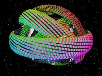 | Keywords: Dyson rings donut.PNG Dyson sphere Dyson ring Niven ring Dyson swarm in DONUT version folding combo self-made Donut idea from http //www burtleburtle net/bob/scifi/dyson html 2007-08-12 Arnero <pre> //Povray version 3 1; global_settings assumed_gamma 2 2 include colors inc include shapes inc global_settings assumed_gamma 2 0 camera location <0 0 -4> direction <0 0 1 5> up <0 1 0> right < 4/3 0 0 > light_source <800 300 -1000> color Red 1 2 light_source <-800 300 -1000> color Green 1 2 light_source <0 -900 -1000> color Blue 1 2 //sphere <0 0 0> 1 pigment White //Ellipse declare a 1 0; declare b 0 998; //0 declare e sqrt a a-b b ; declare g 3000; //granularity < 10000 due to SDL speed limit // macros can have parameters and are useful for 'programming' scenes macro imper p declare ox cos p a+e; declare oy sin p b; declare dx -sin p a; declare dy cos p b; declare l l-dx oy+dy ox; declare n sqrt dx dx+dy dy ; end //Calculate whole area under ellipse with the same round off errors as in the second loop declare l 0; declare j 0; while j < g declare p j/g 2 pi; imper p declare j j+1; end declare li l; //store declare g2 200; declare la arrayg2; declare lc 0; declare lt li/2/g2; declare l 0; declare j 0; while j < g declare lo l; declare p j/g 2 pi; imper p //Orbit while l>lt //Das trifft wegen > und nicht > nicht vor imper auf declare p l-lt / l-lo j-0 5 + lt-lo / l-lo j+0 5 /g 2 pi; declare lalc p; declare lc lc+1; / sphere <cos p a+e sin p b 0> // NOTE <0 0 0> <1 0 0> <2 0 0> etc 0 1 pigment White / declare lt lt+li/g2; end declare j j+1; // increment our counter end declare widt0 2 pi/g2 1 08; //17 //Last factor is hack Is 1 for circular orbit declare hohe 0 02; //7; declare band union declare j 0; while j < lc declare p laj; imper p declare widt 0;//sqrt widt0 widt0-n n /n 0 1; / //Orbit sphere <ox oy 0> // NOTE <0 0 0> <1 0 0> <2 0 0> etc 0 01 // pigment White / declare j j+1; // increment our counter declare p laj; declare oox ox; declare ooy oy; imper p declare widt sqrt widt0 widt0-pow oox-ox 2 -pow ooy-oy 2 ; declare ox ox-dy widt; declare oy oy+dx widt; / //Sputnik sphere <ox oy 0> // NOTE <0 0 0> <1 0 0> <2 0 0> etc 0 01 // pigment White cylinder <oox ooy 0> <ox oy 0> // NOTE <0 0 0> <1 0 0> <2 0 0> etc 0 01 // pigment White / Quad <ox oy hohe> <oox ooy hohe> <oox ooy -hohe> <ox oy -hohe> declare j j+1; // increment our counter declare oox ox; declare ooy oy; declare p lamod j lc ; imper p / cylinder <oox ooy 0> <ox oy 0> // NOTE <0 0 0> <1 0 0> <2 0 0> etc 0 01 // pigment White / Quad <ox oy hohe> <oox ooy hohe> <oox ooy -hohe> <ox oy -hohe> end declare donut union declare k 0; while k<20 object band rotate <11 0 k/20 360> // pigment White //20 declare k k+1; end / object donut rotate <0 30 0> / / individual panels union Quad <1 -1 0> <-1 -1 0> <-1 1 0> <1 1 0> pigment White / //stars declare R1 seed 0 ; // initialize random number streams declare R2 seed 12345 ; // Create 10 balls along X axis from 0 to 9 declare BallCount 0; while BallCount < 1000 sphere < rand R1 -0 5 15 rand R1 -0 5 12 13> rand R2 /40 declare re00 < rand R1 rand R1 rand R1 >; pigment color rgb re00/max re00 x re00 y re00 z finish diffuse 0 ambient 1 4 declare BallCount BallCount+1; // increment our counter end light_source <0 0 -0> color White 1 4 looks_like sphere 0 0 1 pigment White 10 / replace declare Dyson_Ring difference sphere <0 0 0> // center of sphere <X Y Z> 1 0 // radius of sphere cylinder -1 1 z +1 1 z 0 988 declare k 0; while k < 180 box <-0 005 -1 1 -1 1> <0 005 1 1 1 1> rotate <0 0 k> // <dX dY dZ> in degrees declare k k+10; // increment our counter end bounded_by sphere 0 1 01 / declare radi 1 3; //superfluos declare sca -0 09; union object donut pigment White rotate <52 6625 0 0> scale radi exp sca 0 object donut pigment White rotate <52 6625 -72 0> scale radi exp sca 1 object donut pigment White rotate <52 6625 -144 0> scale radi exp sca 2 object donut pigment White rotate <52 6625 -216 0> scale radi exp sca 3 object donut pigment White rotate <52 6625 -288 0> scale radi exp sca 4 object donut pigment White rotate <10 8125 0 0> scale radi exp sca 5 object donut pigment White rotate <10 8125 -72 0> scale radi exp sca 6 object donut pigment White rotate <10 8125 -144 0> scale radi exp sca 7 object donut pigment White rotate <10 8125 -216 0> scale radi exp sca 8 object donut pigment White rotate <10 8125 -288 0> scale radi exp sca 9 rotate <25 0 0> </pre> Freeman Dyson Space colonization Planetary systems Created with Persistence of Vision |