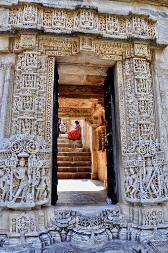 Keywords: dzinijska temple religion stone architecture building entrance gateway stairs carving designs monument ranakpur india hdr
