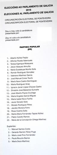 | Keywords: E. ao Parlamento de Galicia 2016. C. E. de Pontevedra. PP.jpg gl Eleccións ao Parlamento de Galicia 2016 Circunscrición Electoral de Pontevedra 2016-09-25 13 59 47 own HombreDHojalata other versions cc-zero PD-SpanishGov es se borro el logotipo del partido político por copyright borrouse o logotipo do partido político por copyright Ballot papers for the 2016 Galician parliamentary election for the province of Pontevedra All medias supported by Wikimedia España in 2016 Ballot papers for Partido Popular Alberto Núñez Feijóo |