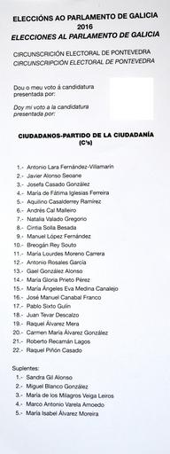 | Keywords: E. ao Parlamento de Galicia 2016. C. E. de Pontevedra. C's.jpg gl Eleccións ao Parlamento de Galicia 2016 Circunscrición Electoral de Pontevedra 2016-09-25 13 57 12 own HombreDHojalata other versions cc-zero PD-SpanishGov es se borro el logotipo del partido político por copyright borrouse o logotipo do partido político por copyright Ballot papers for the 2016 Galician parliamentary election for the province of Pontevedra All medias supported by Wikimedia España in 2016 Ballot papers for Ciudadanos |