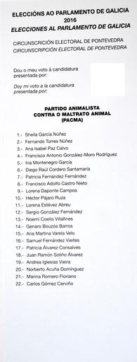 | Keywords: E. ao Parlamento de Galicia 2016. C. E. de Pontevedra. PACMA.jpg gl Eleccións ao Parlamento de Galicia 2016 Circunscrición Electoral de Pontevedra 2016-09-25 13 58 44 own HombreDHojalata other versions cc-zero PD-SpanishGov es se borro el logotipo del partido político por copyright borrouse o logotipo do partido político por copyright Ballot papers for the 2016 Galician parliamentary election for the province of Pontevedra All medias supported by Wikimedia España in 2016 Ballot papers for Partido Animalista Contra el Maltrato Animal |