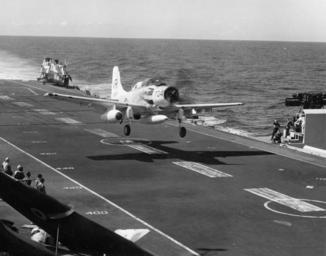 Keywords: EA-1F VAW-13 HMS Victorious 1963.jpeg A U S Navy Douglas EA-1F Skyraider of electronic warfare squadron VAW-13 Zappers making a touch-and-go landing on the British aircraft carrier HMS Victorious R38 off Cubi Point Philippines in late 1963 during a five-day exercise of U S British and Australian carriers Note the two Westland Wessex helicopters parked on the fantail and the folded wings of a DeHavilland Sea Vixen fighter in the foreground U S Navy Naval Aviation News February 1964 http //www history navy mil/nan/backissues/1960s/1964/feb64 pdf; also US National Museum of Naval Aviation photo No 1996 253 2283 http //collections naval aviation museum/emuwebdoncoms/pages/doncoms/Display php irn 16035177 QueryPage 2FAdvQuery php 1963 USN PD-USGov-Military-Navy AD-5 A-1E Skyraider AD-5Q EA-1F Skyraider HMS Victorious R38 Electronic Attack Squadron 130 United States Navy