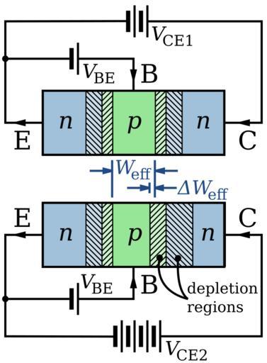 Keywords: Early effect (NPN).svg Early effect or base-width modulation in an NPN BJT When the collector voltage is raised relative to the base and emitter i e the collector-base junction's reverse bias is increased the depletion region hashed area at the collector-base junction widens and the effective width W<sub>eff</sub> of the base is reduced This results in a higher collector i e output current own Inductiveload 2010-08-03 Early effect NPN zh hans svg Early effect NPN zh hant svg BJT circuits |