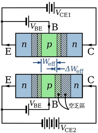 Keywords: Early effect (NPN) zh hant.svg Early effect or base-width modulation in an NPN BJT When the collector voltage is raised relative to the base and emitter i e the collector-base junction's reverse bias is increased the depletion region hashed area at the collector-base junction widens and the effective width W<sub>eff</sub> of the base is reduced This results in a higher collector i e output current Early_effect_ NPN svg 2010-08-14 20 32 UTC Early_effect_ NPN svg Inductiveload derivative work KeepOpera <span class signature-talk >talk</span> Chinese localization KeepOpera Early_effect_ NPN svg BJT circuits |