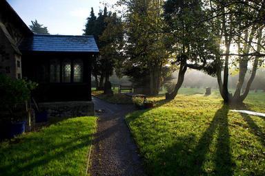 Keywords: early morning sun november misty churchyard gravestones trees medieval porch