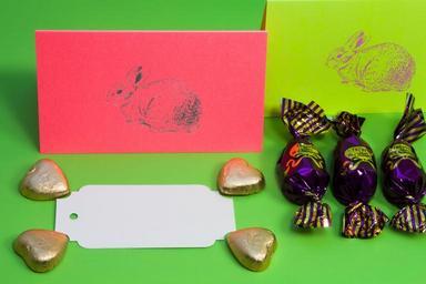 Keywords: easter bunny chocolate pralines gold hearts spring frühlingsanfang spring awakening easter red green yellow violet silver coinage text box die cut colorful