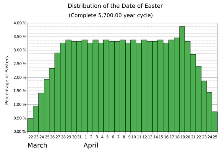| Keywords: Easter Distribution.svg en Bar chart of the distribution of Easter Dates for the complete 5 700 000 Gregorian years 19 April is the date on which Easter falls most frequently in about 3 87 of the years 22 March is the least frequent with 0 48 (computus) 2016-03-18 own Edasubert other versions cc-zero Computus Easter |