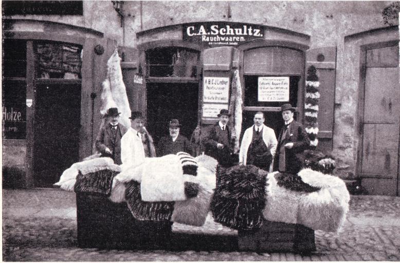 Keywords: Easter fur fair in Leipzig, C. A. Schultz, 1905.jpg Rauchwaaren C A Schultz Carl August Schultz Brühl 45 zur Zeit der Oster-Pelzmesse 1905 in Leipzig Gegründet 1840 von Johann Gottlieb Schultz feierte das Pelzhaus Schultz 1965 sein 125jähriges Bestehen 1971 à bergabe des Gründungsbetriebs in Posen an den Bruder Hermann bald darauf siedelte Carl August nach Leipzig über Nachfolge durch den der Sohn der Kürschner Benno Schultz der 1899 die Leitung des Posener Betriebs übernahm den er drei Jahre später käuflich erwarb und bis nach dem Zweiten Weltkrieg erhielt Erst die beiden Söhne mussten die Heimat verlassen Kürschnermeister Hans Schultz eröffnete nach dem Krieg auf der Niddastraße 54 in Frankfurt am Main ein Unternehmen mit Pelzkonfektion und Rauchwarenhandel Carlheinz Schultz eröffnete in München auf der Kaufinger Straße 10 ein Detailgeschäft für feine Pelzwaren Beide Betriebe bestanden noch 1965 <small>Quelle Die Pelzwirtschaft 1 Januar 1965 S 107</small> Own possession 1905 author PD-old DEFAULTSORT Schultz C A Fur wholesale dealers in Leipzig Brühl 45 Leipzig Tibet lamb fur-skins Intermediate furs Fur fairs in Leipzig 1905 Fur pieces Die Pelzwirtschaft |