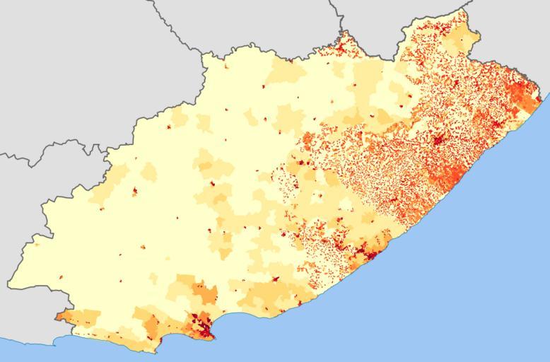 | Keywords: Eastern Cape 2011 population density map.svg ffffcc <1 inhabitant/km² ffeda0 1 “3 inhabitants/km² fed976 3 “10 inhabitants/km² feb24c 10 “30 inhabitants/km² fd8d3c 30 “100 inhabitants/km² fc4e2a 100 “300 inhabitants/km² e31a1c 300 “1000 inhabitants/km² bc0026 1000 “3000 inhabitants/km² 800026 >3000 inhabitants/km² Projection is Albers Equal-Area Conic with standard parallels at 25 5° S and 31 5° S and origin at 28 5° S 25 5° E Statistics South Africa's Census 2011 is the source of the basic population data The map results from my own processing of the data Htonl 2013-10-22 http //beta2 statssa gov za/ page_id 425 The following license applies to the population data on which the map is based the user acknowledges Stats SA as the source of the basic data wherever they process apply utilise publish or distribute the data and also that they specify that the relevant application and analysis where applicable result from their own processing of the data The following tag applies to the map itself Demographic maps of South Africa Maps of the Eastern Cape |