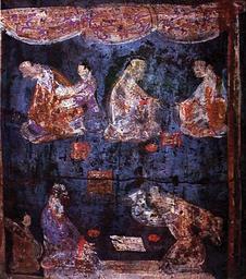 | Keywords: Eastern Han Luoyang Mural of Liubo players.jpg en Detail of a mural from an Eastern Han tomb at Zhucun æ ±æ ‘ Luoyang 洛陽 Henan province The two figures in the foreground are playing Liubo with the playing mat between them and the Liubo board to the side of the mat The two red circular objects next to the liubo board are probably intended to represent lacquer wine cups The player on the right is taking his turn with his right hand raised up as if about to throw down the six throwing sticks The mural is coloured using Han Blue and Han Purple pigments Scanned from Wen Wu 1992 no 12 Author Easter Han 25-220 AD Art of the Han Dynasty Liubo PD-old PD-1996 |
