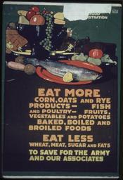 | Keywords: "Eat More corn, oats, and rye products- Fish and Poultry- Fruits, vegetables and potatoes baked, boiled and broiled... - NARA - 512585.jpg Scope and content General notes 512585 Local identifier 4-P-146 U S Food Administration Educational Division Advertising Section 01/15/1918 - 01/1919 Still Picture Records Section Special Media Archives Services Division NWCS-S National Archives at College Park 8601 Adelphi Road College Park MD 20740-6001 other date circa 1917 1919 Record group Record Group 4 Records of the U S Food Administration 1917 - 1920 Record group ARC 333 World War I Posters compiled 1917 - 1919 Series ARC 512439 File unit File unit ARC Variant control numbers NAIL Control Number NWDNS-4-P-146 Other versions <gallery> File Eat_More_corn _oats _and_rye_products-_Fish_and_Poultry-_Fruits _vegetables_and_potatoes_baked _boiled_and_broiled _-_NARA_-_512585 tif tif File Eat_More_corn _oats _and_rye_products-_Fish_and_Poultry-_Fruits _vegetables_and_potatoes_baked _boiled_and_broiled _-_NARA_-_512585 jpg jpg </gallery> NARA-cooperation PD-USGov World War I posters of the United States United States Food Administration Fish in art |