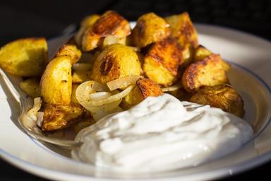 Keywords: eat potato food meal eat drink benefit from tasty young potato potato dish fried potatoes serve quark delicious fork plate rosemary oven baked