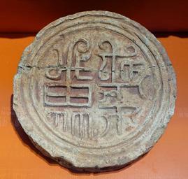 | Keywords: Eaves tile with reversed inscription 'wansui' (longevity), Nanyue Kingdom period, from the site of Nanyue Kingdom Palace - Hong Kong Museum of History - DSC00848.JPG Bề mặt ngói ống với dòng chữ Vạn Tuế 萬歲 ngược được tìm thấy tại di tích cung điện Phiên Ngung th i nhà Triệu nước Nam Việt hiện trưng bày tại Bảo tàng Lịch sử Hồng Kông en Exhibit in the Hong Kong Museum of History Hong Kong This artwork is old enough so that it is in the public domain Photography was permitted in the museum without restriction 2014-07-27 01 47 43 own Daderot other versions PD-100 cc-zero Chinese ceramics in the Hong Kong Museum of History Uploaded with UploadWizard Ceramics of Nanyue |
