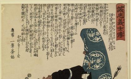 | Keywords: Ebiya Rinnosuke - Seichu gishi den - Walters 9552 - Detail A.jpg Walters Art Museum artwork Creator Ebiya Rinnosuke The tale of the forty-seven loyal warriors is based on events that took place in Japan in the years 1701-03 The warriors vowed to avenge the death of their master Lord Enya Hangan who had been ordered to commit suicide as punishment for drawing his sword and attacking a high official in the palace This official who had in fact provoked Hangan was the evil Moronao Following two years of planning the warriors actually ronin former samurai who have lost their master finally killed Moronao in his home A year later they too were ordered to perform ritual suicide A dramatization of the actual events appeared on the Kabuki stage almost immediately The best-known play Chushingura was written for the puppet theater in 1748 between 1847 1848 late Edo pigments mulberry paper cm 36 2 25 5 accession number 95 52 40876 Mr and Mrs C R Snell Jr date and mode of acquisition unknown Walters Art Museum Gift of Mr and Mrs C R Snell Jr 1986 Signature Ichiyusai Kuniyoshi ga The Nature of Loyalty Japanese Warrior Prints of the Nineteenth Century The Walters Art Gallery Baltimore 1989 place of origin Edo present-day Tokyo Japan Walters Art Museum license 2D Japanese prints in the Walters Art Museum Historic samurai prints Ebiya Rinnosuke Media contributed by the Walters Art Museum needs category review |