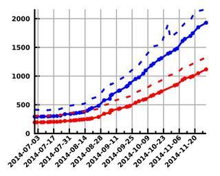 | Keywords: Ebola guinea2014.svg de Ebola in guinea 2014 Blau Bestätige Fälle gestrichelt inkl vermutete Fälle Rot davon Todesfälle gestrichelt inkl vermutete Fälle en Ebola virus disease in Guinea 2014 blue confirmed cases broken line including probable and suspect cases red confirmed deaths broken line including probable and suspect deaths 2014-08-24 19 10 53 own Data http //www who int/csr/don/archive/disease/ebola/en/ http //www who int/csr/disease/ebola/situation-reports/archive/en/ StefanPohl cc-zero v fl gnuplot 5 1 CVS reset set terminal svg size 600 480 fname 'Verdana sans-serif bold' fsize 18 lw 5 unset key set grid lt 1 lc rgb 0xAAAAAA lw 5 set border 3 lw 75 set tics nomirror set xdata time set timefmt ' Y- m- d' set format x ' Y- m- d' set autoscale fix set xtics 60 60 24 14 nomirror rotate by 45 right set for i 1 4 style line i ps 75 pt 7 set style line 1 lc rgb 0x0000FF dt 2 set style line 2 lc rgb 0x0000FF set style line 3 lc rgb 0xFF0000 dt 2 set style line 4 lc rgb 0xFF0000 NA ' ' do fordata in 'ebola_guinea2014 ebola_liberia2014 ebola_sierraleone2014' set output data ' svg' set yrange 0 plot data ' txt' \ u 1 strcol 2 eq NA strcol 3 eq NA strcol 4 eq NA 8 2+ 3+ 4 ls 1 w lines \ u 1 2 ls 2 w linespoints \ u 1 strcol 5 eq NA strcol 6 eq NA strcol 7 eq NA 9 5+ 6+ 7 ls 3 w lines \ u 1 5 ls 4 w linespoints set output data '_log svg' unset yrange set logscale y replot unset logscale y Grafikwerkstatt Uploaded with UploadWizard 2014 Ebola outbreak statistics |