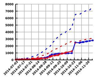 | Keywords: Ebola liberia2014.svg de Ebola in Liberia 2014 Blau Bestätige Fälle gestrichelt inkl vermutete Fälle Rot davon Todesfälle gestrichelt inkl vermutete Fälle en Ebola virus disease in Liberia 2014 blue confirmed cases broken line including probable and suspect cases red confirmed deaths broken line including probable and suspect deaths 2014-07-11 10 01 55 own Data http //www who int/csr/don/archive/disease/ebola/en/ http //www who int/csr/disease/ebola/situation-reports/archive/en/ StefanPohl cc-zero v gnuplot 5 1 CVS reset set terminal svg size 600 480 fname 'Verdana sans-serif bold' fsize 18 lw 5 unset key set grid lt 1 lc rgb 0xAAAAAA lw 5 set border 3 lw 75 set tics nomirror set xdata time set timefmt ' Y- m- d' set format x ' Y- m- d' set autoscale fix set xtics 60 60 24 14 nomirror rotate by 45 right set for i 1 4 style line i ps 75 pt 7 set style line 1 lc rgb 0x0000FF dt 2 set style line 2 lc rgb 0x0000FF set style line 3 lc rgb 0xFF0000 dt 2 set style line 4 lc rgb 0xFF0000 NA ' ' do fordata in 'ebola_guinea2014 ebola_liberia2014 ebola_sierraleone2014' set output data ' svg' set yrange 0 plot data ' txt' \ u 1 strcol 2 eq NA strcol 3 eq NA strcol 4 eq NA 8 2+ 3+ 4 ls 1 w lines \ u 1 2 ls 2 w linespoints \ u 1 strcol 5 eq NA strcol 6 eq NA strcol 7 eq NA 9 5+ 6+ 7 ls 3 w lines \ u 1 5 ls 4 w linespoints set output data '_log svg' unset yrange set logscale y replot unset logscale y Grafikwerkstatt Uploaded with UploadWizard 2014 Ebola outbreak statistics |