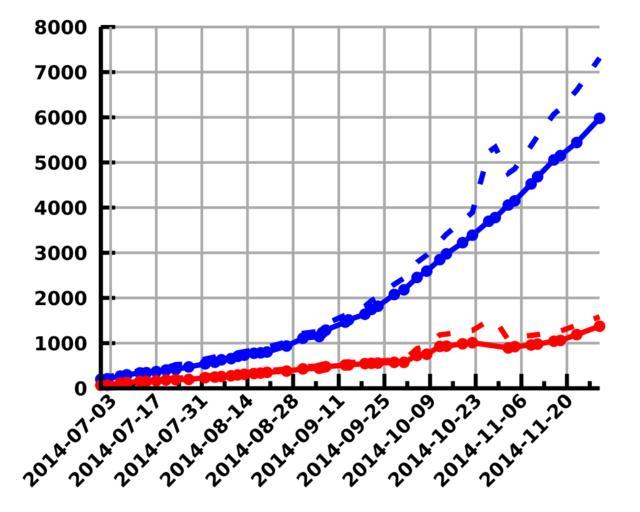 | Keywords: Ebola sierraleone2014.svg de Ebola in Sierra Leone 2014 Blau Bestätige Fälle gestrichelt inkl vermutete Fälle Rot davon Todesfälle gestrichelt inkl vermutete Fälle en Ebola virus disease in Sierra Leone 2014 blue confirmed cases broken line including probable and suspect cases red confirmed deaths broken line including probable and suspect deaths 2014-08-24 19 10 53 own Data http //www who int/csr/don/archive/disease/ebola/en/ http //www who int/csr/disease/ebola/situation-reports/archive/en/ StefanPohl cc-zero v gnuplot 5 1 CVS reset set terminal svg size 600 480 fname 'Verdana sans-serif bold' fsize 18 lw 5 unset key set grid lt 1 lc rgb 0xAAAAAA lw 5 set border 3 lw 75 set tics nomirror set xdata time set timefmt ' Y- m- d' set format x ' Y- m- d' set autoscale fix set xtics 60 60 24 14 nomirror rotate by 45 right set for i 1 4 style line i ps 75 pt 7 set style line 1 lc rgb 0x0000FF dt 2 set style line 2 lc rgb 0x0000FF set style line 3 lc rgb 0xFF0000 dt 2 set style line 4 lc rgb 0xFF0000 NA ' ' do fordata in 'ebola_guinea2014 ebola_liberia2014 ebola_sierraleone2014' set output data ' svg' set yrange 0 plot data ' txt' \ u 1 strcol 2 eq NA strcol 3 eq NA strcol 4 eq NA 8 2+ 3+ 4 ls 1 w lines \ u 1 2 ls 2 w linespoints \ u 1 strcol 5 eq NA strcol 6 eq NA strcol 7 eq NA 9 5+ 6+ 7 ls 3 w lines \ u 1 5 ls 4 w linespoints set output data '_log svg' unset yrange set logscale y replot unset logscale y Grafikwerkstatt Uploaded with UploadWizard 2014 Ebola outbreak statistics |
