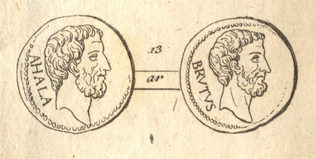 Keywords: Eckhel ii 13.jpg 2005-06-15 own assumed Carlomorino Roma - ca 54 BC - Brutus - denarius O// BRVTVS - Lucius Jiunius Brutus the founder of the Roman Republic a supposed ancestor of the moneyer r - R// AHALA - Servilius Ahala a defensor of the freedom an other supposed ancestor of the moneyer r - Iunia 30 e Servilia 17; Sydenham 932; Crawford 433/2; from an Italian translation of Eckhel Kurzgefasste Anfangsgründe zur alten Numismatik Vienna 1787 - Self scanned Roma - ca 54 AC - Bruto - denario D// BRVTVS - Lucio Giunio Bruto il fondatore della Repubblica un supposto antenato del monetario dx R// AHALA - Servilio Ahala un difensore della libertà un altro supposto antenato del monetario dx Iunia 30 e Servilia 17; Sydenham 932; Crawford 433/2; dalla traduzione italiana del manuale numismatica scritto da Eckhel Other versions thumb left File Ahala jpg Denarius Lezioni elementari di Numismatica antica Lucius Junius Brutus Gaius Servilius Ahala |