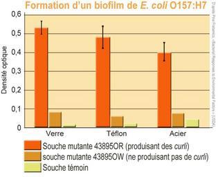 Keywords: EColiUSDAfromPinaFratamico.jpg en Biofilm formation of E coli O157 H7 strains 43895OR OR; curli-producing and 43895OW OW; non-curli-producing on glass Teflon and stainless steel surfaces fr Formation de biofilms à partir de deux souches mutantes de Escherichia coli O157 H7 l'une OR produisant des curli et l'autre OW n'en produisant pas et par rapport à un échantillon témoin normal lors de cultures sur différentes surfaces verre téflon et inox USDA http //www ars usda gov/Research/docs htm docid 6732 Direct source page named éBacterial Responses to Environmental Factors é Pina Fratamico 10/24/2006 Last Modification of the pag http //www ars usda gov/research/projects/projects htm accn_no 409248 National Programs International Programs Find Research Projects The Research Enterprise Office of Scientific Quality Review Research Initiatives You are here Research / Research Project MOLECULAR CHARACTERIZATION OF PATHOGENS AND THEIR RESPONSES TO ENVIRONMENTAL FACTORS Project Number 1935-42000-051-00 Project Type Appropriated PD-USGov Escherichia coli Biofilms