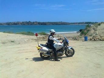 Keywords: ecuador sea ocean water beach outside spring summer motorcycle cop policeman patrol