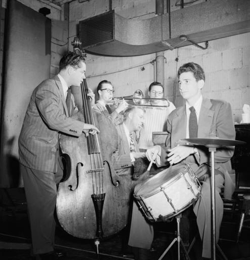 | Keywords: Eddie Safranski, Kai Winding, Stan Kenton, Pete Rugolo, and Shelly Manne, ca. Jan. 1947 (William P. Gottlieb 05041).jpg en Eddie Safranski Kai Winding Stan Kenton Pete Rugolo and Shelly Manne ca Jan 1947 Photograph by William P Gottlieb LOC-image music gottlieb 05041 http //lcweb2 loc gov/diglib/ihas/loc natlib gottlieb 05041/enlarge html page 1 section ver01 size 1024 from Creator William P Gottlieb 1947-01 PD-Gottlieb Photographs by William P Gottlieb Black and white photographs of the United States in the 1940s Stan Kenton Kai Winding Pete Rugolo Shelly Manne Percussion brushes Drum kit sticks and beaters Eddie Safranski |