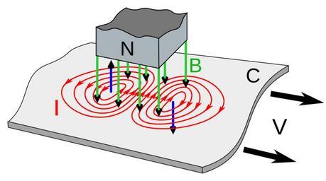 | Keywords: Eddy currents due to magnet.svg eddy currents I <span style color red; >red</span> induced in conductive metal sheet C moving under a stationary magnet N showing the origin of the braking force The magnetic field lines B <span style color green; >green</span> from the North pole of the magnet extend down through the sheet The increasing field at the leading edge of the magnet left causes the currents to circle counterclockwise Thus from Lenz's law they create their own magnetic field directed up <span style color blue; >left blue arrow</span> which opposes the magnet's field thus exerting a drag effect on the magnet Similarly at the trailing edge of the magnet right the decreasing magnetic field induces eddy currents that circle clockwise This creates a magnetic field directed down <span style color blue; >right blue arrow</span> which attracts the magnet which also exerts a retarding force on the magnet 2014-07-22 12 16 52 own Chetvorno cc-zero Uploaded with UploadWizard Eddy current brakes Eddy currents |