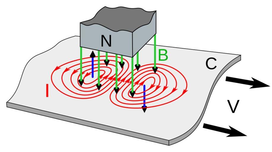 | Keywords: Eddy currents due to magnet.svg  eddy currents I <span style color red; >red</span> induced in conductive metal sheet C moving under a stationary magnet N showing the origin of the braking force The magnetic field lines B <span style color green; >green</span> from the North pole of the magnet extend down through the sheet The increasing field at the leading edge of the magnet left causes the currents to circle counterclockwise Thus from Lenz's law they create their own magnetic field directed up <span style color blue; >left blue arrow</span> which opposes the magnet's field thus exerting a drag effect on the magnet Similarly at the trailing edge of the magnet right the decreasing magnetic field induces eddy currents that circle clockwise This creates a magnetic field directed down <span style color blue; >right blue arrow</span> which attracts the magnet which also exerts a retarding force on the magnet 2014-07-22 12 16 52 own Chetvorno cc-zero Uploaded with UploadWizard Eddy current brakes Eddy currents |