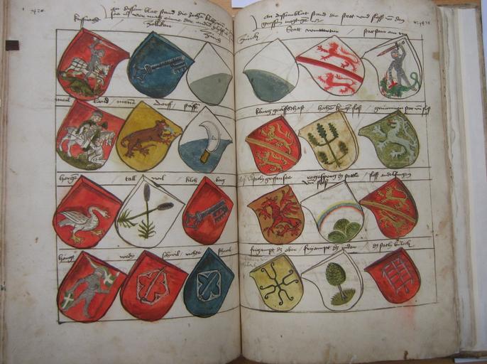 | Keywords: Edlibach Wappen.jpg Wappen von Zürcher Gemeinden in Edlibachs Zürcher Chronik http //www handschriftencensus de/11323 S 420/1 Darstellung von Wappen der Zürichseegemeinden und Zürcher Vogteien Zürichseegemeinden Küsnacht ZH Hl Georg Zollikon Schlüssel Petri Meilen ZH Hl Martin Männedorf Fischotter Stäfa Gertel Horgen Schwan Thalwil Rohrkolben Kilchberg ZH Schlüssel Petri Höngg Hl Mauritius Wädenswil Mantelschliesse Richterswil Mantelschliesse Vogteien Winterthur Löwen Stein am Rhein St Georg Kyburg Löwen Hohenklingen entspricht dem Wappen Clingen der Zürcher Wappenrolle Grüningen Löwe Greifensee Greif Regensberg Regenbogen Andelfingen wie Kyburg aber unterer Löwe verkehrt oberes Freiamt unteres Freiamt Baum Bülach Laurentiusrost Unverändert als Gemeindewappen verwendet werden heute die gezeigten Wappen von Zürich Horgen Thalwil Wädenswil Winterthur Grüningen Greifensee Bülach; mit Änderungen die von Kyburg mit der Änderung der Schildfarbe von rot zu schwarz s Wikipedia Stein am Rhein St Georg heute beritten statt wie bei Edlibach zu Fuss Männedorf Fischotter in schwarz und steigend nach heraldisch rechts Regensberg silberner Regenbogen auf rotem Grund Andelfingen der untere Löwe ist wieder nach rechts ausgerichtet dafür ein zusätzlicher Stern zur Unterscheidung vom Kyburger Wappen Die Zürcher Gemeinden Küsnacht Zollikon Meilen Kilchberg und Höngg änderten ihre auf Kirchpatrone verweisenden Wappen nach der Reformation S 420 an dissem blatt stand die zechen kilchhövinen an Zürich see und verman eine der anderen zehilff ob in men Kussnacht / Zollikon / Zurich Meilland / Mennedorff / Stäffe Horgen / Tallwil / Kilchberg Höngt / Wedyschwil / Richteschwil S 421 ann dissem blat stand die stett und slossz von den grossen vogtiyen / Zürich / Statt Winttertur / statt stein am rin Kyburg gräffschaft / hochen klingen slosz / grünningen stat und slosz / Schlosz und stetlij greiffensee / regensperg dz stettle und slosz / slosz andelfingen friyampt dz ober der herren von eschibach / frijampt dz nider / dz stetlin büloch Zürich Zentralbibl Cod A 75 circa 1490 / vor 1530; upload Januar 2008 Gerold Edlibach / upload by Adrian Michael PD-old Edlibachs Zürcher Chronik Coats of arms of Switzerland |